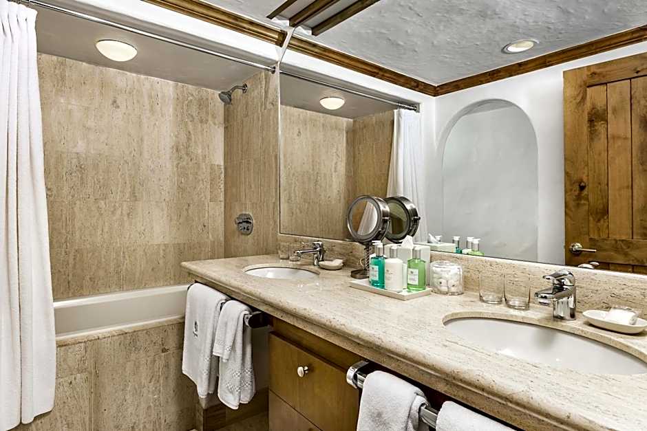 Bathroom has heated floor and double vanity. Room includes fully stocked mini bar, flat screen TV and personal safe.
